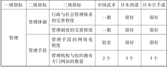 管理指标下设2个二级指标和4个三级指标。在管理体制方面,通过对钱源泽老师的访谈得知,中国武术在管理体制方面已经取得巨大进步,但某些方面仍存在不足,包括行政管理体系人员分配不合理、段位制改革艰难等问题,如国际武术联合会的高层大多为中国人,反观日本武道国际联盟高层大多为外国人,这在一定程度上降低了武术的国际化程度。此外,武术信息的不透明也影响到了武术现代化转型的进程。中国武术协会官方网站和国际武术联合会官方网站是武术发展之窗,也是世人了解武术的重要渠道。通过研究发现,中国武术协会官方网页资讯少、公开信息少,缺少武术发展现状通报,关于武术组织的评估更是寥寥无几,缺少对武术活动、赛事情况、收支情况等的记录,不符合中国体育大国、体育强国形象。中国武术与日本武道管理指标测评结果如表4-5所示。