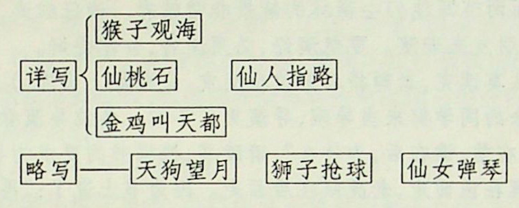 (学生再按三段详写的要求,调整排列顺序。并说明因为“仙桃石”和“仙人指路”都与神仙的传说相关,可以合并一段)。