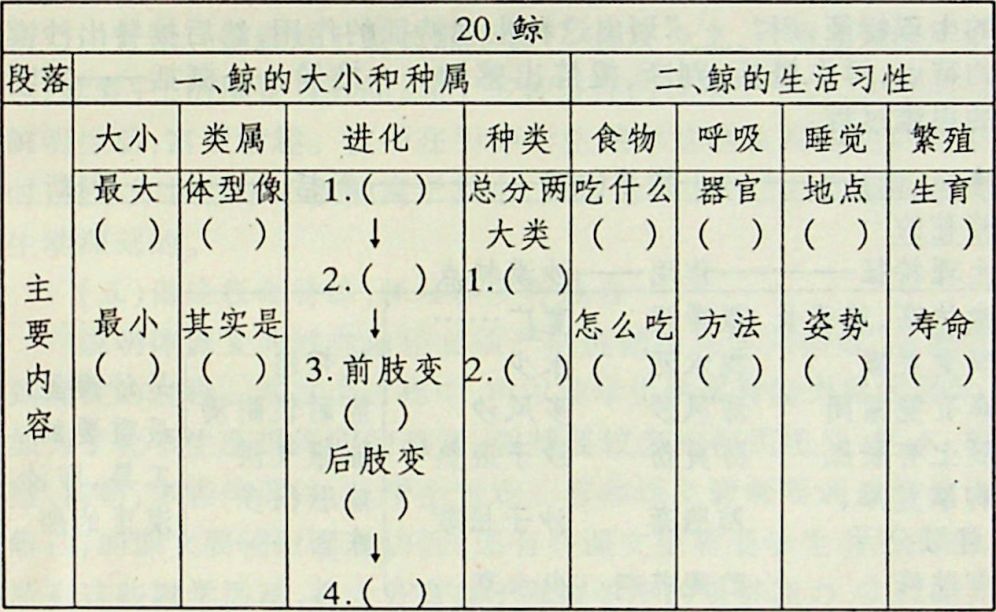 有的说明体课文适宜于列表的方法,显示其结构的严密性和内容的条理性。如《鲸》,可列下表: