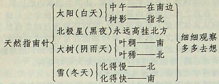 从归纳的“提要”中,明确地显示了全诗条理井然、头绪清晰的特色。全诗从四个方面告诉孩子在野外辨别方向的方法。而这四个方面又体现了在昼夜、季节和天气等各种自然条件下可以利用的“天然指南针”,写得严密周详。最后又自然地归结出要真正掌握在野外辨别方向的本领,关键是要“细细观察,多多去想”。这个总结,对儿童是很具启示性的。