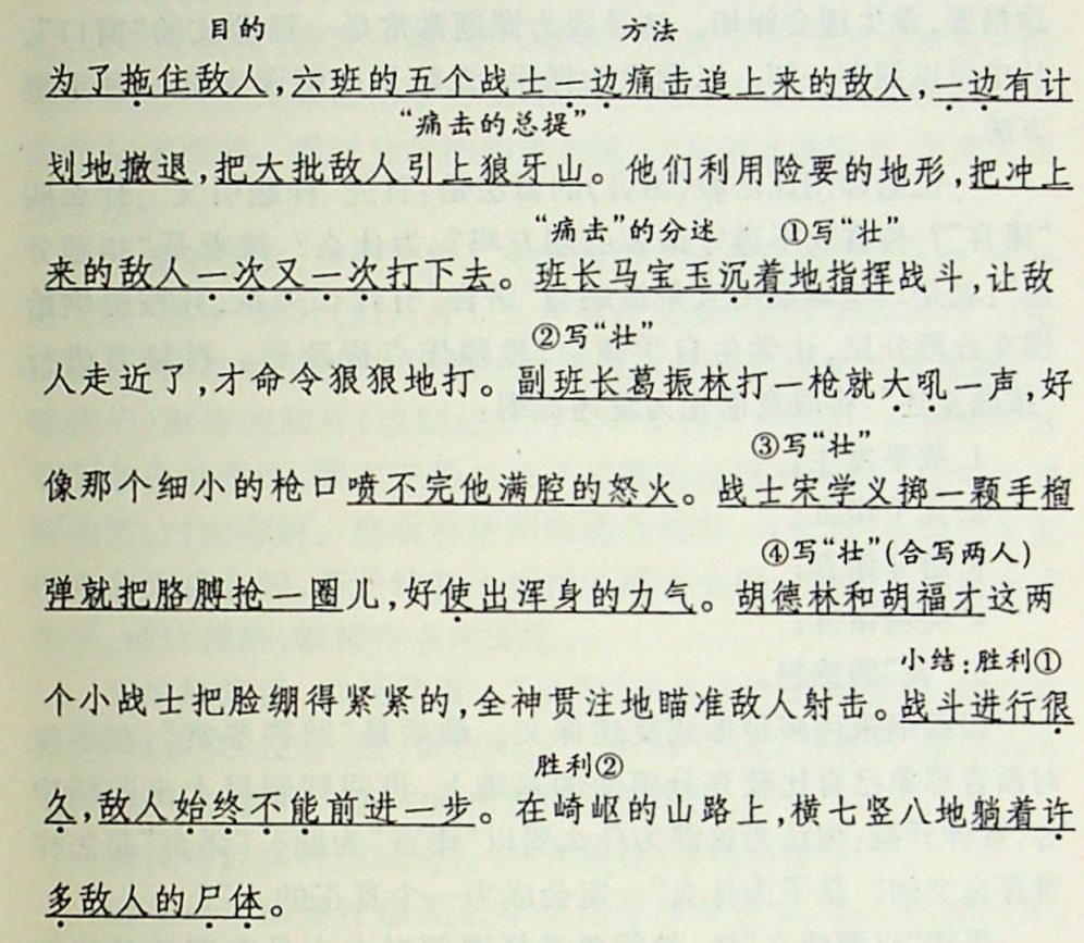 如在教《狼牙山五壮士》一文时,教师要学生集中对第二小节怎样有层次地表现“壮”的字或词作圈点划注: