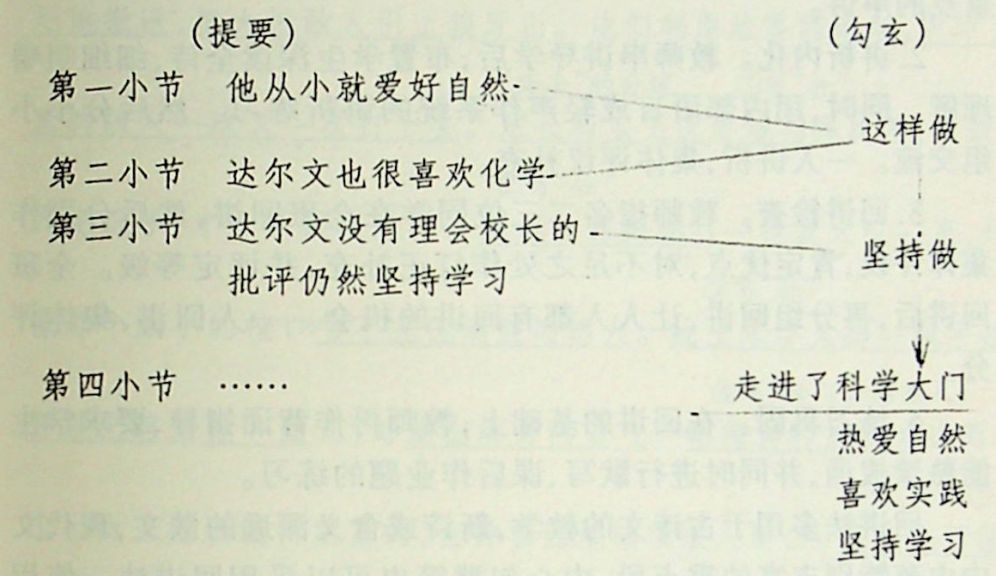 如第三小节,教师就让学生讨论这一节的几个主要意思:“达尔文把实验结果告诉学生——校长知道了训斥他——达尔文不理会仍坚持学习”,哪一个是主要的,学生就不难明白:写“达尔文告诉学生”是“校长知道了”的原因,这又是校长训斥达文的原因,而写这一点最终是为了突出“达尔文坚持学习”,所以后者是主要的。