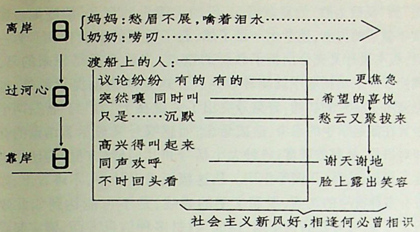 板书巧妙地辅以河道和表示“离岸”、“过河心”、“靠岸”的渡船图像,使课文的结构层次表现得十分生动形象,从而集中说明了这个动人的故事,就发生在渡船上索不相识的人们之间,有力地揭示出“社会主义新风好,相逢何必曾相识”这个主题。