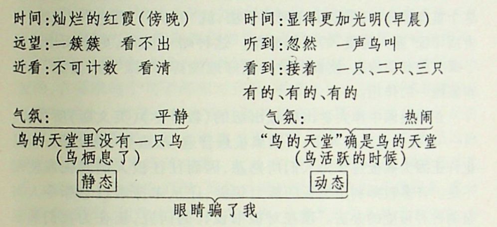 板书设计从“时间”、“气氛”等四方面,提炼关键词语,进行“相似组合”,又从“静态”和“动态”两大块进行相反组合,收到了很好的效果。本来,要在《鸟的天堂》一文中落实本组的读写训练重点“静态和动态”,对学生来说有一定的难度,但是由于教师在板书设计时借助了对比的组合效应,把“动静不同”这个课文中不易理解之处剖析得清淸楚楚。