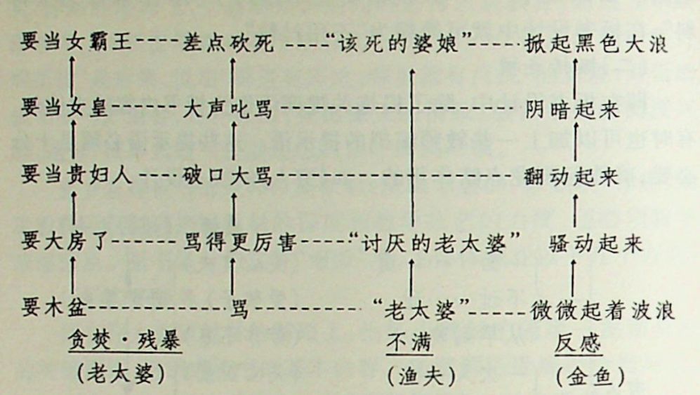 烦琐的语言表达,而且可以使人一目了然,在“缩微”过程中具有十分重要的作用。如《渔夫和金鱼的故事》一文的板书设计: