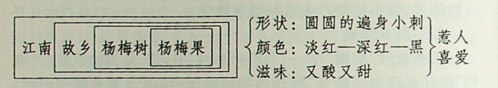 板书设计的整体图像,采用了“集合”的形式,由“江南”而“故乡”,由“故乡”而“杨梅树”,由“杨梅树”而“杨梅果”,采用高度浓缩的手法,表现出作者借物抒情,爱国爱乡的思路。但是对“杨梅果”这个重点部分,又采取了详列的手法,就“形状”、“颜色”、“滋味”三方面印证“惹人喜爱”的强烈感情。这种略中见详,更全面地反映了课文的必要信息,使板书设计更好地发挥“缩微”与“显隐”这种辩证统一的作用。