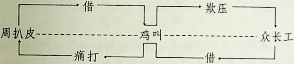 这个板书既反映课文思路——全文以“半夜鸡叫”这件怪事为主线,借助“周扒皮借鸡叫欺压众长工”和“众长工借鸡叫痛打周扒皮”这个曲折生动的故事情节,反映了旧社会剥削阶级和劳动人民之间的尖锐斗争,长工们的智慧和老地主的愚蠢;也反映了设计者的思路——突出详写周扒皮凶狠欺压和众长工巧计痛打的过程,而略写其余的东西,体现了本课是“详写和略写”这个重点训练项目中的阅读课文。另一方面,板书还反映出教师的教学构想:在落实“详写和略写”这个教学知识的同时进行思想教育,通过显示故事哲理:“周扒皮借鸡叫欺压众长工”是前因,“众长工借鸡叫痛打周扒皮”是后果,说明“哪里有压迫,哪里就有反抗”的真理;并借助板书的巧妙组合,连环效应,突出课文的情致,激发学生的阅读兴趣,培养“按事索理”、边读边想的良好阅读习惯。