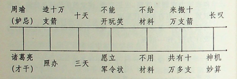 由此不难看出,文字提炼先要紧扣教材思路。本文围绕“箭”这个中心展开的一场斗智,反映了诸葛亮顾全大局,善于研究思索,巧妙排难的聪明才智。板书选用的关键词语,充分考虑了足以反映这个斗智过程,各个扭结点,形成连贯性很强、能统摄全篇的悬念、波澜和高潮。由此形成的板书,既高度精炼概括,又足以反映课文全貌,如此才是“缩微”。另一方面,教师对关键词语的选用又要为教学思路服务。从设计中可以看出,教师用对比法教这一课,以充分发挥教材特点,落实本组的读写训练重点。当然提关键词语,并不是照搬课文,有些词语根据板书需要也可作适当简缩或改编。如课文中“……只说诸葛亮不用竹子、翎毛、胶漆这些材料”,在板书设计中就可简缩为“不用材料”。
