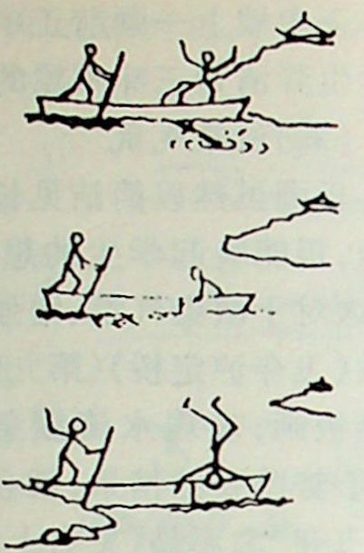 有的课文蕴含深邃,不易理解,教师若能借助于板画,则会有利于揭示文意。如教学《刻舟求剑》(第四册)时,学生对船在不停地前进,情况在不断地变化这个意思不容易理解,教师就以板画相辅,收到了较好的效果(见右图)。