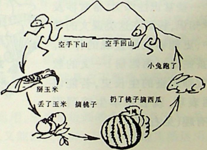 线索是贯穿全文的经络,在语文教学中教师导读课文,引导学生提取线索,是读懂课文的重要方法。在这方面,也可以通过板画来实现。如教《小猴子下山》(第二册)时,对小猴子空手下山,一路上捡了这个丢了那个,结果一事无成,只好空着手回山这条线索,可以以简明的图示得到表现。这样不仅能增加学习情趣,而且使课文机理清晰地呈现在学生面前(见右图):