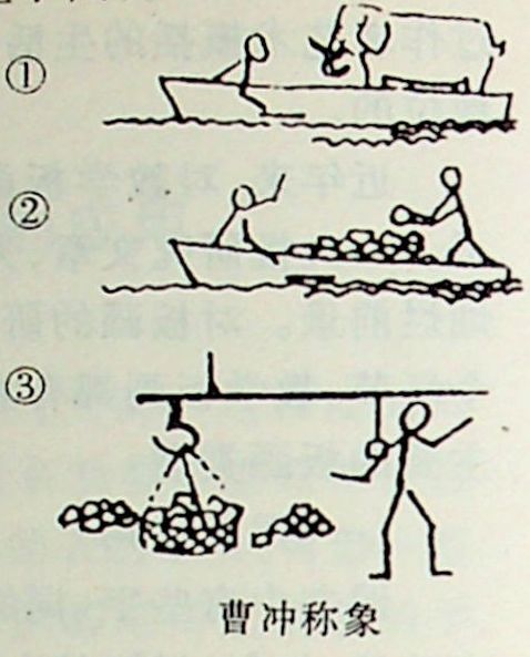 有的课文以情节见长。学生对情节理解的程度关系着对课文内容主旨的领会。如讲读《称象》时学生对曹冲称象的具体过程必须理解准确,才能读懂课文,教师若能运用板画就可以把情节交待得比较清楚(见右图)。