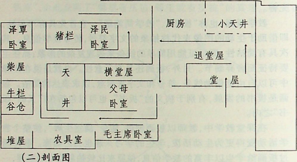 一种采用平面示意的板图,多用于交待方位。如课文《回韶山》,详述了作者陪同毛主席回故乡旧居的所见所闻。课后第二题要学生“想想毛泽东同志回到韶山旧居,都到了哪些地方”。要指导学生学好本课,教师对课文中的堂屋、灶屋、横堂屋……等的位置和当时他们的参观顺序,必须作清晰的指点。如能边导读边画出韶山旧居的平面图,无疑会取得极佳的教学效果(见下图)。