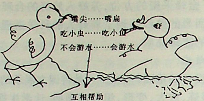 兴趣,是少年儿童学习动机中最现实、最强烈的心理因素。而教学板画又最能诱发学生兴趣,唤起遐想,吸引注意。在学习的整个认知过程中,往往有这样一条规律:学习兴趣越浓厚,“自求”的行为越强烈;而“自求”的行为越强烈,则“自得”也更深刻。教学板画的运用,最能体现自好→自求→自得→自悦这个诱导心理效应模式,从而极大地调动学生学习的主动性。如《小公鸡和小鸭子》(六年制第一册)的板画(图见下页)。