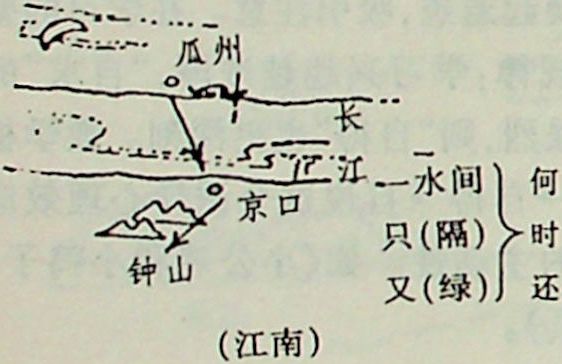 教学板画的暗示作用,是由知觉的冲动直接变为运动而发的动作,这是一种自主性的反射动作。这种视觉暗示效应是由板画的构图造成的。如看了图中的箭头,自然要向前头所指的方向看去;看了三角形轮廓,自然会特别注意三个顶端有些什么;看了一个表圆的弧线,必然会对圆周作回旋运动,引发为什么回旋的思考。教学板画的含蓄性、大容量,往往能产生更大的暗示效应。如教学古诗《夜泊瓜洲》时所作的教学板画(见左下图)中的两个箭头,必然会使学生体会到从瓜洲到京口到钟山的距离之短,以及长江、月下孤舟夜泊的情境,也会唤起旅途的寂寞凄淸的情感,而“何时还”后的一个问号一个感叹号,又必然会激发学生的思索,从而体会到诗人思念家乡的怅然心境。所有这些,都是教学板画独具的暗示效应所产生的。
