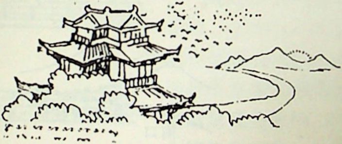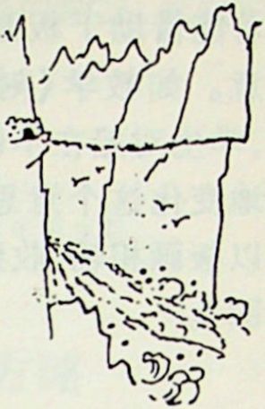 板画虽然以简洁见长,但寥寥几笔构成的画面,很能唤起学生的想象,笔情画意逗人遐想,这对于渲染气氛、增强情感是很有帮助的。如教《飞夺泸定桥》(第九册)一课时,如能辅以简笔板画,表现水流湍急、高山峻峭、守备严密、形势险要的情景,就会有助于渲染气氛,突出“飞夺”之不易(见右上图)。
