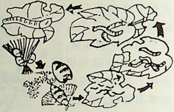 一些常识性课文,常常涉及科学知识,板画在这类课文的教学中,更能够发挥直观的作用。如《蚕姑娘》(第四册)一文的教学,教师对蚕的生长史,若能以板画表现,就会使学生感到形象、有趣(见右图)。