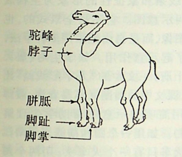 即事物的正面形象。如教《沙漠里的船》时,为了便于学生对骆驼身上的胼、脏、驼峰、脚掌、脚趾等部位的认识及其作用的理解,就可以配合板书,画出骆驼的立面图(见左下图)。