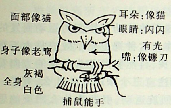 教学板画设计的重要特点之一,是将课文展示的自然、社会现象,进行某种提炼、放大、变形,组合成画面,让学生摆脱时空限制进行认知。这种经整合后的板画图像,整体地输入大脑之后,很容易成为表象而获得再现,成为易于唤起的记忆。如《猫头鹰》(六年制第五册)这篇课文,比较完整地介绍了猫头鹰的外部特征和生活习性。特别是从捕鼠能手的角度,强调了它的耳朵、眼睛、嘴、爪等部分的特殊功能。如果要学生再现课文的文字符号而掌握内容,那就比较困难了,但一经整合成图像后,以图像符号贮存,就很容易被再现。(见左图)。
