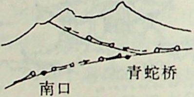 以符号、线条和象征性的形象为主构成的板画叫示意图。它不是全景式的,也不全是图像,而是自由地采用多种手法,主要为了起示意作用。如学生对《詹天佑》(第十册)一文中的“人字形线路”比较难懂,课文中的插图又不易看清,教师就可以用简明的示意图帮助学生理解(见下图)。如用一个圆和横线表示南江口前的火车只有一个火车头;用两个圆和横线表示过了青龙桥就用两个火车头,前拉后送上陡坡。这就靠以图示意了。