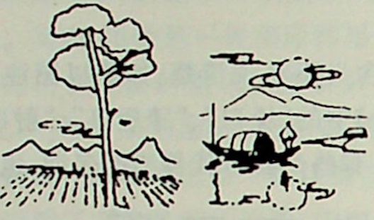 有些句子的含意很具形象性,教师如只作抽象解释,往往难于言传,如能辅以图像便能让学生充分领会其含意。如《古诗三首·宿建德江》(第八册)中的名句:“野旷天低树,江清月近人。”既具意境,又含哲理,教师不妨以板画助讲读(见左下图)