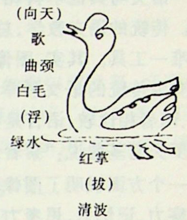 教学板画在学生看来仿佛是教师兴之所至,一挥而就的潇洒之作。因此,每当栩栩如生的画面,瞬间出现在黑板上,唤起学生无限遐思之时,往往会引起课堂上一片惊叹之声。这便是教学板画带来的轰动效应。无疑,此时此刻被板画吸引的孩子,情绪是异常兴奋,精神会格外专注,思维也会空前活跃,各种理解、想象乃至灵感都会奔涌而至,其教学效果之佳,也就不言而喻了。如教《鹅》(六年制第一册)这首古诗时,教师用一笔画出了曲项高歌的白鹅(见左图),使全班学生为之轰动,取得了很好的教学效果。