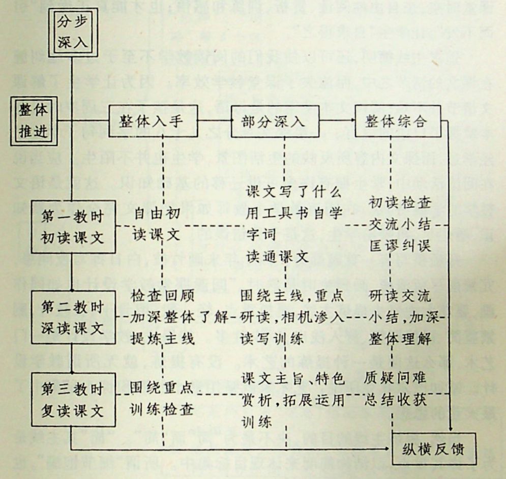 按照“整体推进、分步深入”的策略,如一篇课文在三教时内完成,可作如下安排,试以图示: