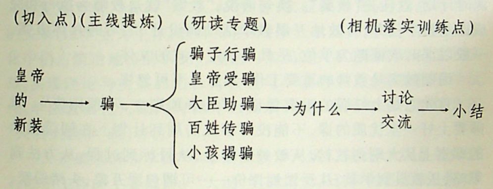 对一些内容特别复杂,情意特别含蓄的课文,提炼主线有一定难度,教师也可以引导学生先评议课文,从评议中发现抓手,从而拎出主线。如全国著名中学语文特级教师宁鸿彬先生教安徒生童话《皇帝的新装》时,在初读课文的基础上,要学生用一个字来概括故事情节?学生用了“蠢”、“骗”、“伪”、"假”、“傻”、“装”等等。经过讨论比较择优,最后统一在一个“骗”字上。于是主线便提炼出来: