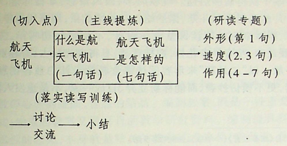 以说明为主的课文,不妨从“说明”切入,提出勾通全文的主线。全国著名特级教师左友仁教《航天飞机》这一课,从抓“说明”入手:什么是航天飞机?(找出了课文中的一句话:航天飞机是专程来往于地球和宇宙之间的飞行器)航天飞机是怎样的?(再找出课文中的七句话:1.尖尖的……方方的……两侧雄壮威武;2.他飞得……每小时怕有……;3.他不能飞出……;4.他专程来往于……之间;5.有时……送上轨道去;6.有时……做各种实验;7.有时把……又把……)如: