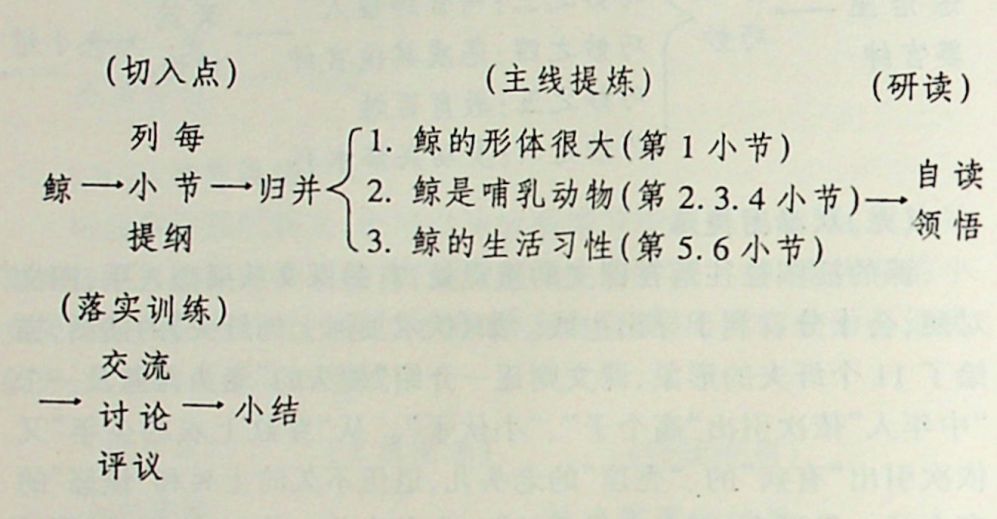 叫学生自读课文,列出每小节的提纲,尔后归并排列,形成一条主线,供学生研读。如《鲸》一课的深读,教师让学生把每小节提纲(自己归纳)想好了就写到黑板上,然后归并意思相同或相近的小节。如:(1)“鲸很大”;(2)“鲸不属鱼类,是哺乳动物”;(3)“鲸是胎生的";(4)“鲸用肺呼吸”;(5)“鲸的吃食”;(6)“鲸的睡觉”。尔后归并研读。如: