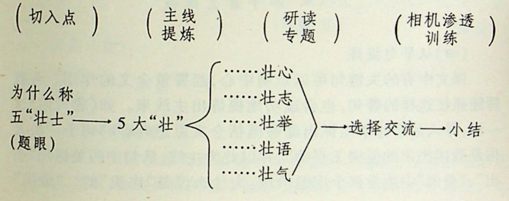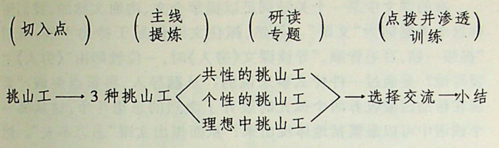 课文的题目,是全文的“旗帜”和“窗口”,抓住题目,常能得其要旨,理出主线,串起全文。如《挑山工》一课,教师从课题切入,提问:课文中写出了哪三种挑山工?学生细读课文,从讨论中很快归结出有三种挑山工,即“共性的挑山工”(第1段),“个性的挑山工”(第2段起,写作者有一次遇到的那位挑山工),“理想中的挑山工”(课文末尾作者画成画中的挑山工,一个不断奋发前进的理想形象)。这样,就可以让学生围绕这三种“挑山工”自学全文,并任选“一种挑山工”作研读讲析交流。其主线图示为: