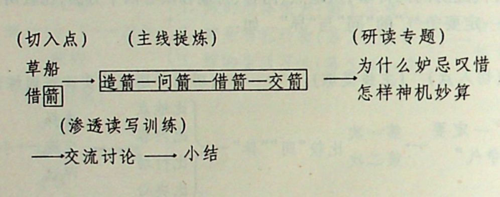 课文的情节发展总是有线索可循,线索在串连内容方面有重要作用。有些课文的线索能把头绪纷繁的课文条理化、简约化,这对于提炼主线是很有帮助的,如《草船借箭》这篇课文,故事生动发展曲折,若以“线索”提炼,便可化繁为简,条理清晰。如: