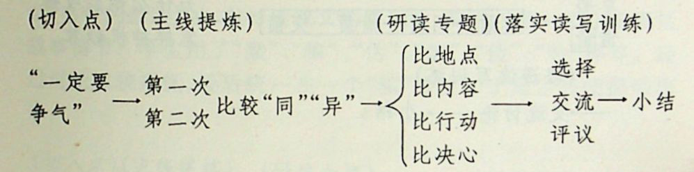 对一些采用对比、类比的手法写成课文,抓住其比较的内核,也有助于提炼出主线。如课文《一定要争气》,可紧扣童第周学生时代经历的两件事,从地点、内容、行动和决心四个方面,比较两次“一定要争气”的“同”与“异”。如: