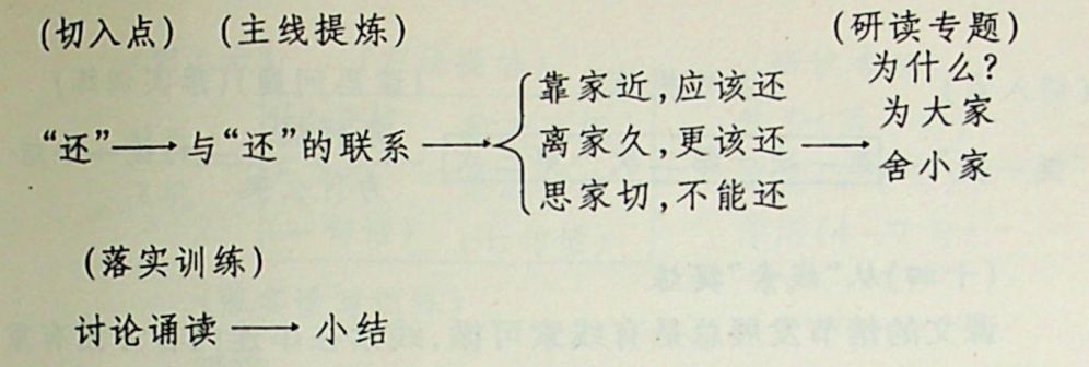 在深读阶段一开始就让学生寻找主旨,并从主旨引出主线,开.展自主研读。如孙双金老师教学古诗《泊船瓜洲》就很有特色,他问:这首诗主要写了什么,能找岀诗中的一个字吗?(“还”)尔后从一、二句诗让大家找与“还”的联系(“靠家近,应该还”),从第3句归结出与“还”的联系(“离家久,更该还”),再从第四句分析出与“还”的联系(“思家切,不能还”)。为什么?点明王安石为变法“舍小家,为大家”的精神。如: