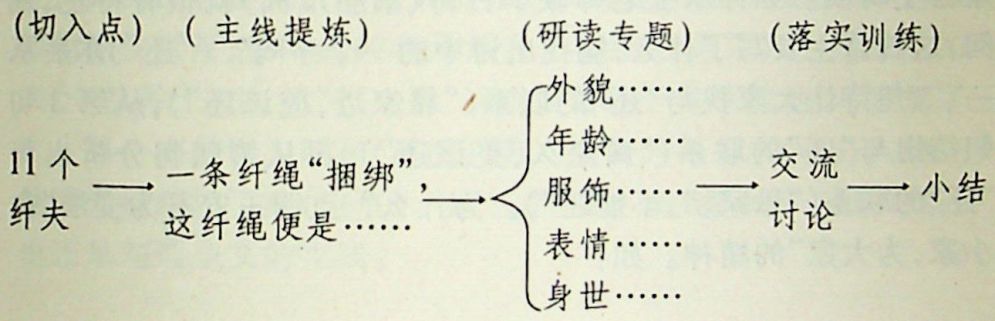 课的插图往往落在课文的重点处,有的课文从插图入手,图文对照,会十分有利于导出主线。如《伏尔加河上的纤夫》的插图,描绘了11个纤夫的形象,课文则逐一介绍“领头的”老头儿兼及一个“中年人”依次引出“髙个子”、“小伙子”。从“穿红上衣的少年”又依次引出“有病”的、“秃顶”的老头儿,退伍不久的士兵和“愤怒”的髙个子。最后介绍“走在最后的"一个老头儿。这11个群像,都被一条纤绳所“捆绑”,而外貌、年龄、身世、服饰、表情各异,以此可形成研读的问题情境: