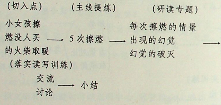 对故事性强的课文,也可以从故事情节中提炼出主线,但这种提炼必须有很强的联系性,方能激起学生的情趣。如《卖火柴的小女孩》这一课,可以小女孩5次擦燃火柴取暖,出现幻觉而又幻觉破灭,形成研读课文的主线: