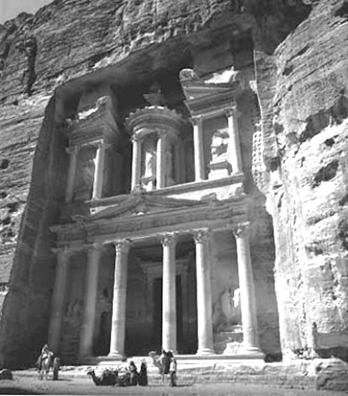 佩特拉不是一座城市。它的颜色也不是玫瑰红的,它的历史也没有人类历史的一半那样久远,但它仍具有不凡之处贝克哈特由叙利亚向开罗南行,途中他突然发现自己正处在佩特拉附近,于是决定去看望一下这长期被遗忘了的城。通往佩特拉的必经之路是一个叫西克的山峡,深约200 英尺。山峡漆黑一片,回声荡荡,可是一转过这个令人毛骨悚然的山峡,则是另一番景观。世上最令人惊叹的建筑就呈现在眼前:高130英尺,宽100英尺,高耸的柱子,装点着比真人还大的塑像,整座建筑完全由坚固的岩石雕凿成形。上图的这座建筑名叫卡兹尼,它最引人注目的特征是其色彩。由于整座建筑雕凿在沙石壁里,阳光照耀下粉色、红色、桔色以及深红色层次生动分明,衬着黄、白、紫三色条纹,沙石壁闪闪烁烁,无比神奇。