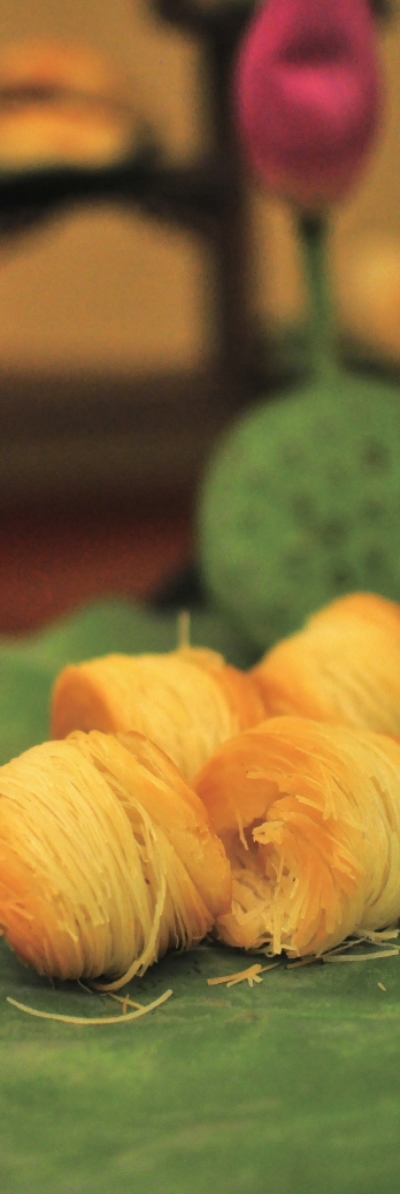 在一个盛夏,带央视栏目组去济南的泉城大酒店拍盘丝饼。待做好了,一看,用一朵红艳的尚未绽开的鲜荷苞、一片翠绿的鲜荷叶,还有一柄鲜莲蓬铺底,几枚黄灿斐然细细脆脆的盘丝饼摆在上面,还没尝,就美透了。