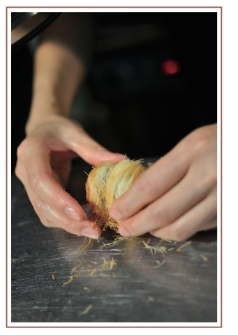初看,是小巧黄灿灿的一朵,像初开的花瓣般微微绽开,再仔细看,却是一圈圈的细丝盘旋环绕着,像纤细的花蕊、像古典美女的发髻般让人着迷。