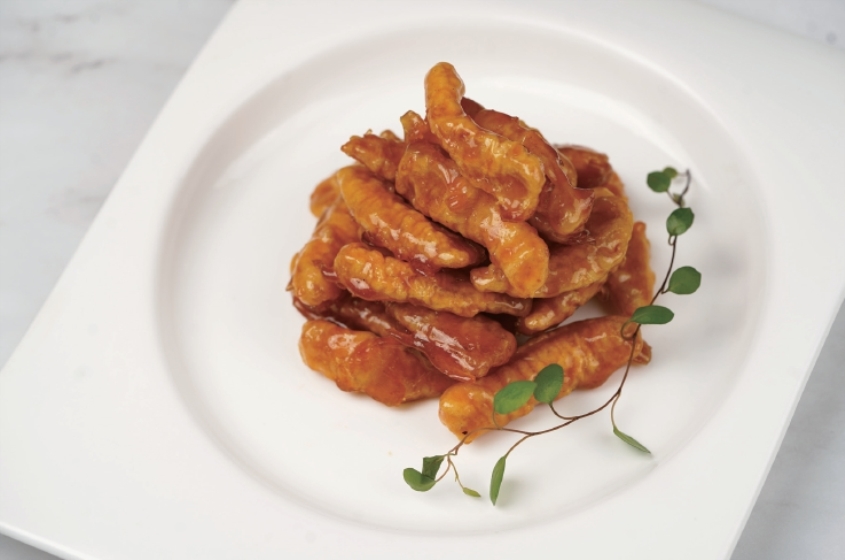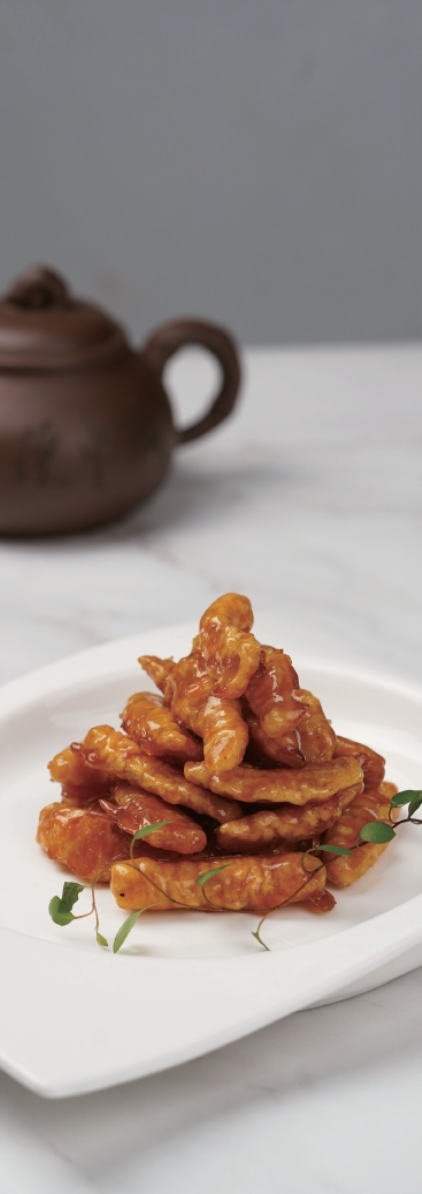 这道琉璃里腔好看极了,棕黄透明,形似琉璃,若是晚上宴席,在灯光下,光影流转,熠熠生辉,妩媚得让人不忍下箸。而吃起来,入口,咬开,外壳酥而脆,咔嚓咔嚓地在唇齿间跳跃,酥脆之后,就是糖浆的甜,由舌尖层层递进,接着就是里面的里腔似融非融的油润丰满,香的啊!口水和着油一起流淌,那感觉是从口腔直冲脑门的幸福的眩晕感。
