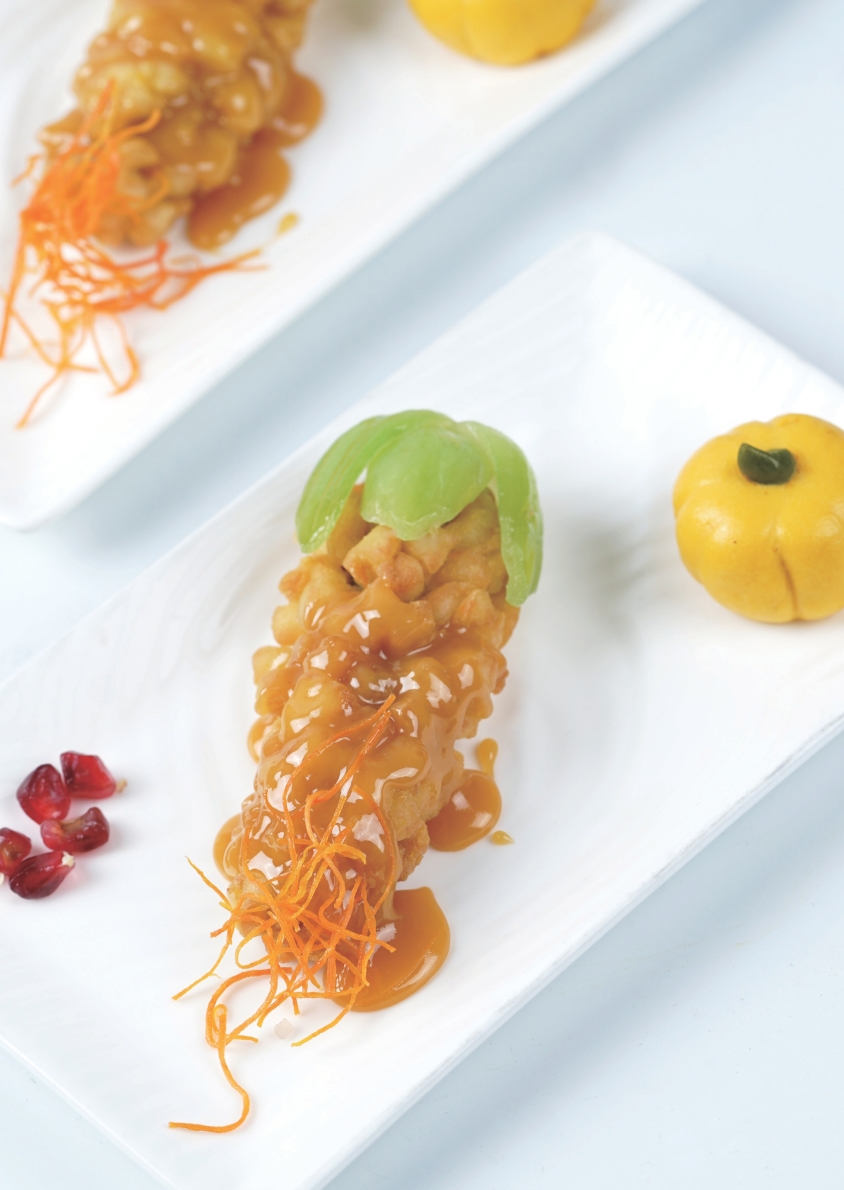 一盘之内,鱼头鱼尾油炸摆盘,头翘尾翘鳍翘是谓三翘,脯酥鱼和棒子鱼分列两边,煞是好看。脯酥鱼片堆叠如山,嫩白若雪,如层峦叠嶂,如涛卷起千堆雪。而棒子鱼,诚如其名,如一支颗粒饱满的玉米,卧在盘中,一勺糖醋汁儿兜头淋上,红艳油亮得诱人,而油菜装饰的玉米叶儿却是翠绿欲滴的,让我想起了以前给棒子鱼写过的一段文字:一条在水里一天到晚游泳的鱼,却偏偏在这个秋季,要化身黑土地上的一支玉米,在秋风里,诉说丰收的喜悦和甜蜜。