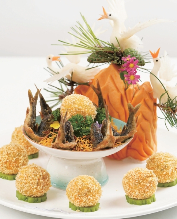 我几年前去泰山拍摄《天南地北山东菜》,在泰山脚下吃到了一道泰山赤鳞豆腐丸。选用“泰安三美”之一的豆腐,与海米末、酱瓜末等调馅挤丸,入油锅炸熟,置于盘中,赤鳞鱼洗净入味,亦入油锅内炸熟,环围于豆腐丸之外,味道极正,鲜美滑嫩,至今难忘。