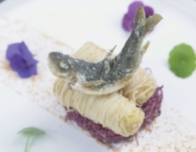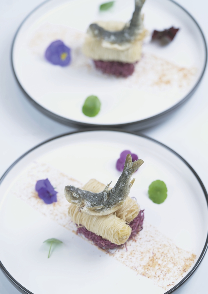 对了,说起这螭霖鱼,有一次,青岛出版社要出一套“味道的传承”系列丛书,让我去云南昆明,去给烹饪大师鄢赪拍摄菜品,鄢赪师傅亲手给我做了一道菜,叫傣味抗浪鱼。这抗浪鱼又叫鱇浪白鱼,轮廓呈一狭长的纺锤形,细小却幼嫩。用云南傣家的秘汁来调味浸泡,酸甜咸辣鲜,五味杂陈,很是好吃。抗浪鱼和这赤鳞鱼有些相似,都细小幼嫩,油脂厚而香醇。改天我想尝试用云南傣家调汁的方法来做做这赤鳞鱼,或许也会有惊喜,这也算是鲁菜的一种借鉴创新吧。