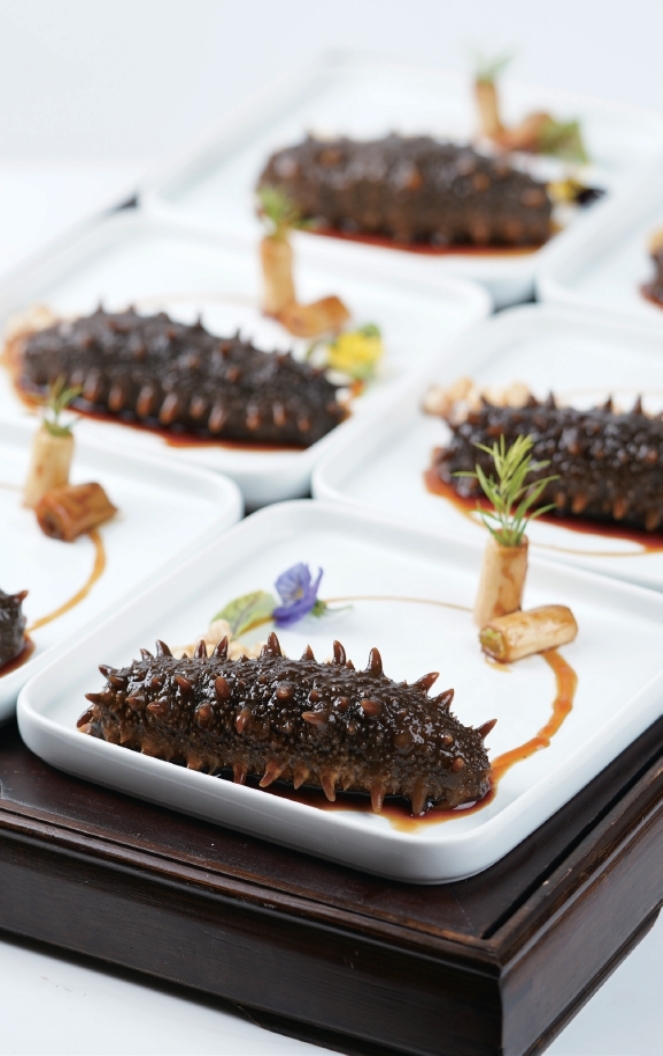 我曾吃过很多海参佳肴,最喜欢的就是葱烧海参,它是鲁菜的代表。胶刺参,干品涨发,配章丘大葱葱油、酱汁烧煨,参刺突出,浑圆肥壮,油亮莹,细细嚼来,软糯滑腻,胶质肥厚,酱汁葱香扑鼻,宽厚黏稠,满口流香回味无穷,堪称完美。我还曾经为葱烧海参胡诌过几句词:“蔚蓝的大海给你靛黑的躯体,我却要用一段大葱,赋予你新的光明。”