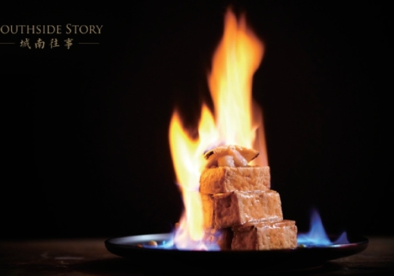 还有一个传说的做法。民国初年博山山头有个“同心居”饭馆掌柜李同心,将豆腐箱的摆盘由“箱式”改为四层小箱摞叠的“塔式”,盘中浇烈酒,名曰“水漫金山寺”,上桌之时,点燃烈酒,顿时浓香四溢,白娘子闻之亦难耐,就又有了“映照金山”“火烧金山”等名字。这种形式的,我还真没吃过。但前不久机缘巧合给别人拍菜谱,拍了一张图片,也算满足了自己的好奇心。