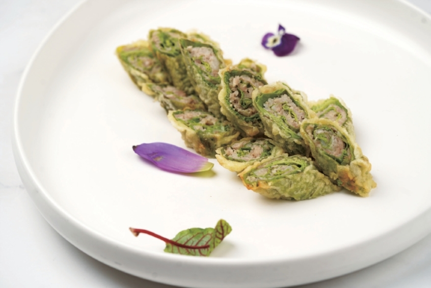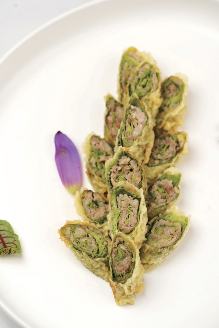 洗净手,手指捻处,荷尖绽开来,把肉馅镶在内里。蛋黄要搅打细匀,加入淀粉,我喜欢再加点面粉,略略饧发,这样的糊裹炸出来的才会有蓬松脆感。包着肉馅的荷尖裹蛋黄糊,油三四成热的时候就得下锅,因为吃的就是荷尖的嫩香,油太热就如同焚琴煮鹤,低温慢炸,待肉馅嫩熟,捞出。待油温升至九成热,下锅复炸,在油中一飞而过,只为让糊酥脆而已。要是掌握不好火候,那就把肉碎炒熟,再夹进荷尖来炸,肉已熟,把蛋黄糊炸酥就好。