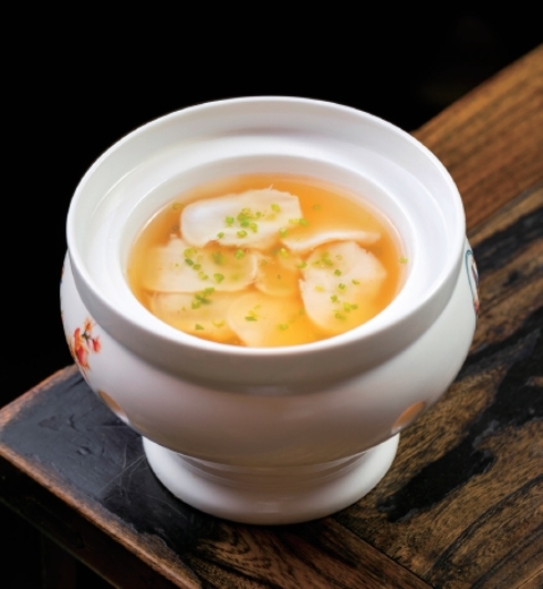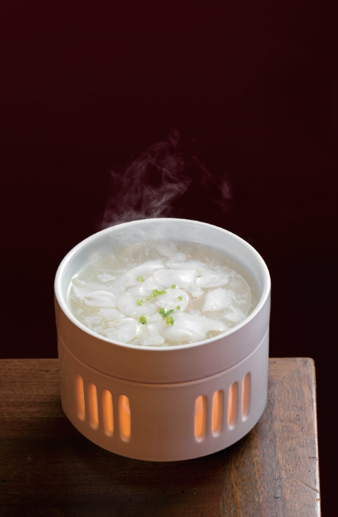 乌鱼蛋本无味,只是食其口感顺滑,借其形态优美,而味道则要借汤味来呈现,所以《随园食单》说要“再加鸡汤蘑菇煨烂”。鲁菜正是极为讲究用汤的,所谓“厨师的汤,唱戏的腔”。吊一锅高汤,舀在汤锅中,下乌鱼蛋片,以陈醋、胡椒提味,汤沸,用水淀粉勾一个玻璃薄芡,芡要轻薄细腻,再浇一次出锅醋,使酸香更醇馥,最后淋入香油,撒香菜末,一道酸辣乌鱼蛋汤才算做好。