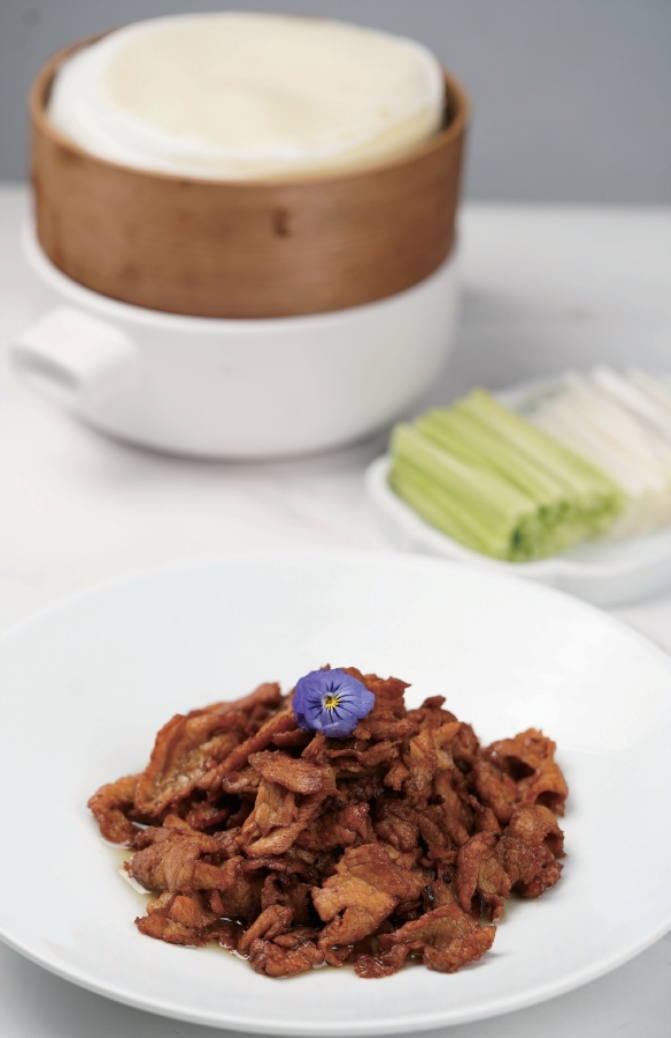 “【做法】猪肉洗净,片薄片,长一寸半,宽八分,厚半分;加葱姜丝、蒜片、甜面酱、酱油、料酒、香油拌匀腌渍十分钟。炉火升到十成热,坐炒勺,加植物油二两。油不能过多或过少,过多则不易燃着,过少则容易将肉燎焦,所以必须准确地掌握用油的数量。待油烧到十二成热,立即将调好的肉片倾入,这时火苗沿锅沿直上,引燃锅内的油,火苗高达二尺多高,必须急速用手勺拨动肉片,并很快颠翻炒勺,使肉片在这火势熊熊的沸油中,半燎半炒约三分钟(作者注:原文如此,估计有误),盛出,与大葱甜面酱同上。