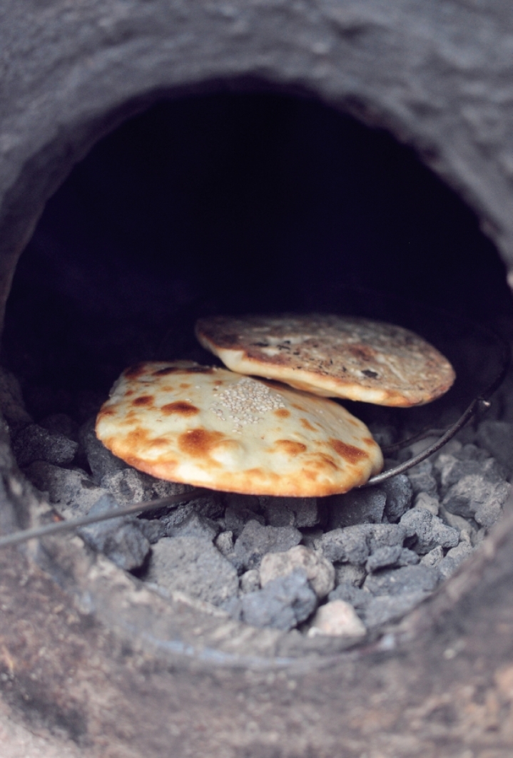 用黄泥和砖垒砌一个六尺高、三尺见方的饼炉,却要在里面垒进一口水缸做炉膛。炉里的炭烧去了刚性的火,只余下热量在炙。面要和得软硬适度,发而不酸,拉而不断,揉搓再三,揪成剂子,再压成软软薄薄的皮。馅儿用的是肥瘦相间的鲜猪肉,手切成细细的碎,章丘的大葱、莱芜的大姜,也都细细地剁碎了,用一点盐调味,搅拌均匀。红的猪肉、青白色的葱、黄色的姜,看着就有食欲。皮儿包上馅儿,转着圈儿包起来,再一压一展一擀,就成了一个薄薄的饼,随手蘸上脱皮芝麻。在炉膛上刷一遍盐水,手托着烧饼,“啪”的一声烧饼就借着热量粘在了炉膛内壁,剩下的就交给时间和炉火了。