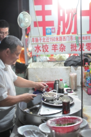 在德州,卖羊肠子的摊子都不大。一个长箱形的推车,中间有一个火炉,上面架着一口烧汤煮肠用的大锅,锅盖是用白铁皮做成的两个半圆形,热气腾腾的,隔了很远就闻到香味扑鼻。有来吃的,摊主就揭开大锅,按客人要肥要瘦的要求,将灌好煮熟的羊肠子放入锅中,稍烫煮片刻,自汤锅中挑起,放到一个浅口粗瓷的蓝边碗中;手持一把薄长利刃,嗖嗖挥舞,手起刀落,须臾,串串羊肠子就被削成了寸许小段;再撒胡椒粉、辣椒油、香菜、盐、味精等调料,舀锅内滚沸的羊汤,浇入羊肠碗中,顿时,香气袅袅,令人垂涎三尺。
