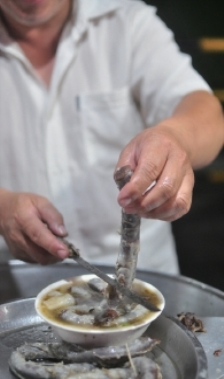 我查过一些资料,说过去在北京庙会或是街面儿的早晚市,都有摆摊卖煮羊霜肠的。有文曰:“羊霜肠可以凉拌来吃,把霜肠烫熟,切寸半段,用酱油、米醋、芝麻酱、香菜拌着吃,清爽香嫩。还有一种吃法类似灌肠,即将羊霜肠切成片,放在铛上煎爆。但一般都是将煮熟的羊霜肠切成小段儿,放入碗中,浇上煮羊霜肠的热汤,放入麻酱汁、酱油、辣椒油、香菜末,还有放酱豆腐汤儿、韭菜末或韭菜花的。一碗热腾腾,又红又绿,香气四溢的羊霜肠,吃者无不夸好。”